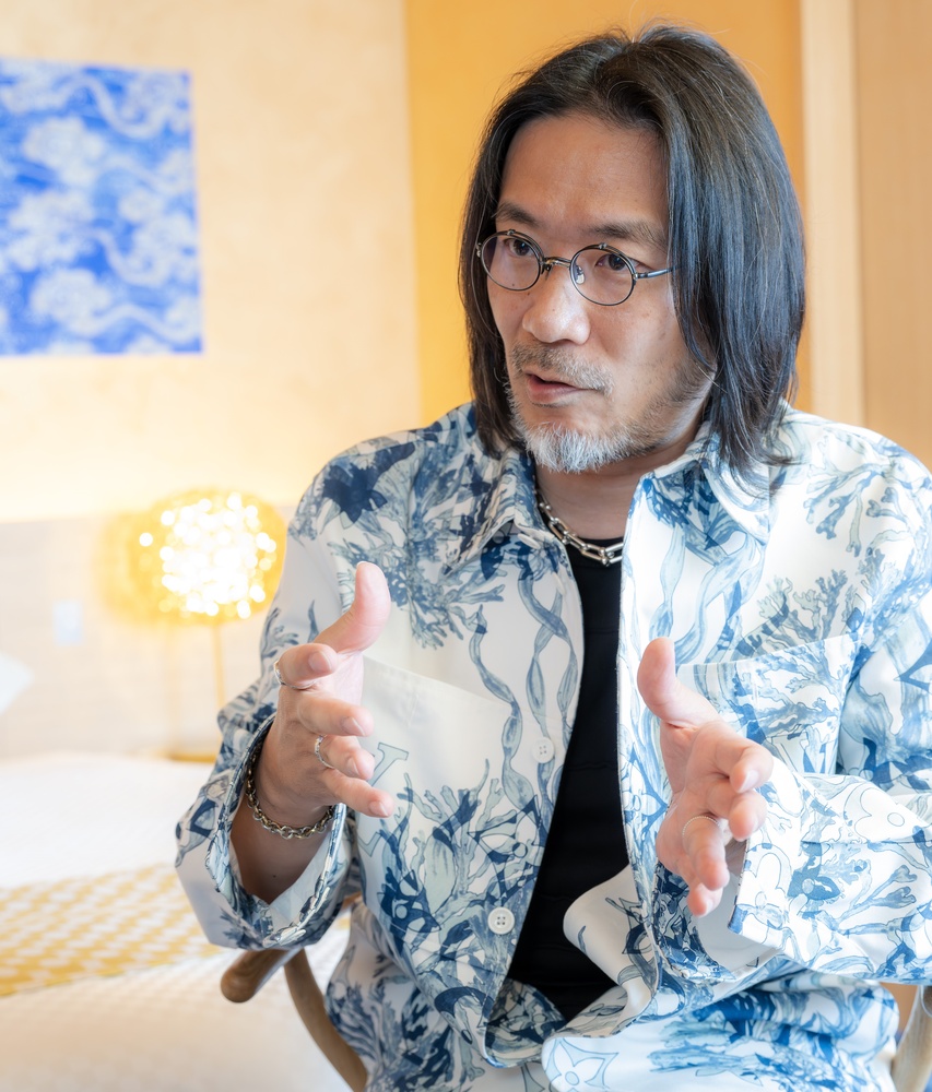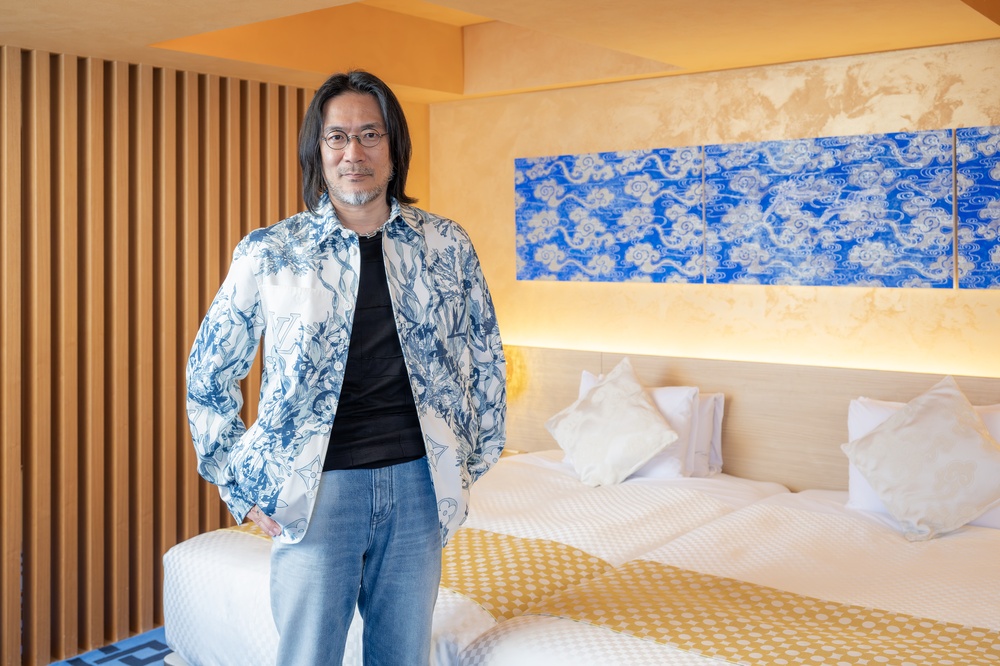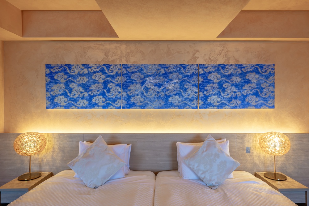 “KIN-UN (Golden Cloud) and GIN-GETSU (Silver Moon) were created as part of the 50th anniversary project of the RIHGA Royal Hotel Kyoto, which has previously been one of our partners. These concept rooms realized my desire to create guest rooms blanketed in patterns. For me, karakami is a culture of light, and when I think of light, I think of the sun and moon. I used that for inspiration in coordinating KIN-UN and GIN-GETSU. I also paid careful attention to the light that hits the artwork, deliberately creating shadows rather than illuminating everything. I think it looks quite different at night.”
