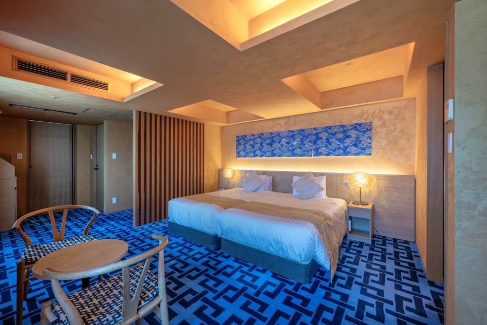 The rug uses Kaku Tsunagi, symbolizing connection and prosperity, while the bed throw and curtains feature Nanban Shippo, expressing a wish for happiness to spread in all directions. The towels and the mirror are originals, while the furniture and lighting were selected by Karacho. This is a one-of-a-kind space where guests can experience the worldview of Karacho’s patterns, replete with positive energy.