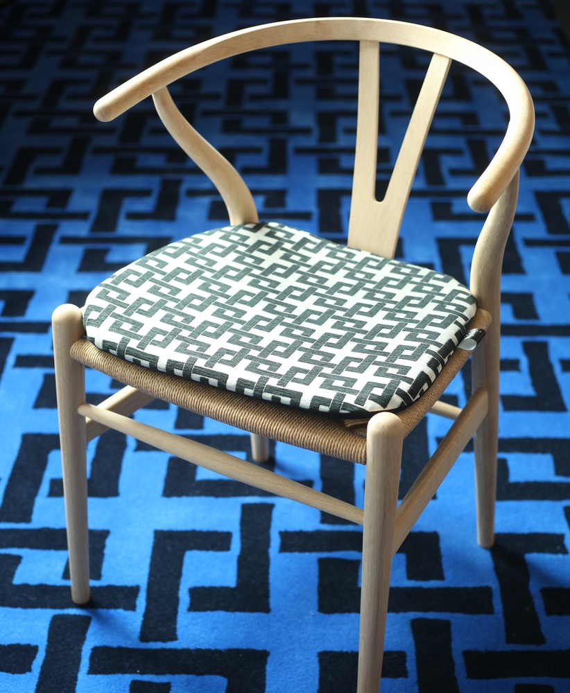 The Kaku Tsunagi (linked corners) pattern on the rug made in collaboration with Kawashima Selkon Textiles is used throughout the room, including on Kira Karacho + ACTUS chair cushions.