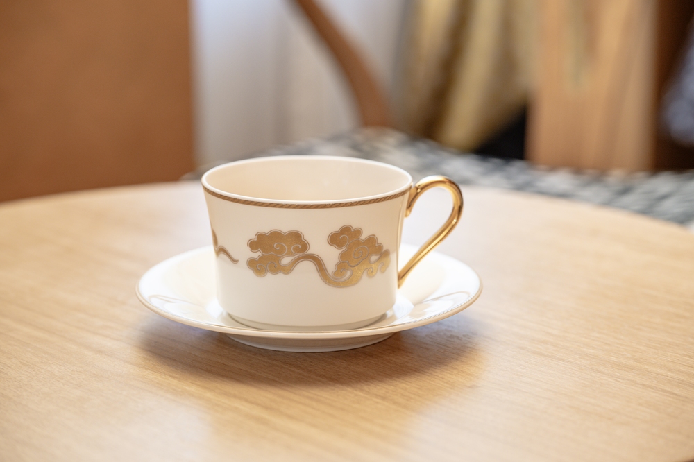 Noritake collaborative cups feature Tenpyo Ogumo patterns.