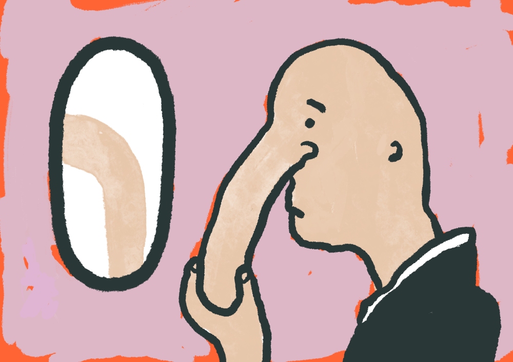 The protagonist of “The Nose,” Zenchi Naigu, is a high-ranking priest serving in the imperial palace’s inner sanctuary, but his large, long nose hangs down to his chin like a sausage and is a source of constant worry. He thinks, “If only my nose were shorter” ... It’s a story that considers the importance of living with pride in yourself, as you are, without worrying about what others think. Illustration by Izumi Shiokawa