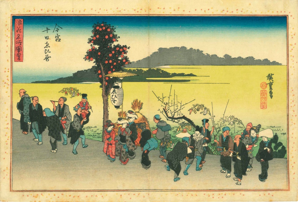 Founded in the year 600, Imamiya Ebisu Shrine enshrines Ebisu, one of the Seven Lucky Gods, and regarded as the most powerful deity of good fortune. Revered since at least the Heian period as the guardian deity of markets, Ebisu (divine name: Kotoshironushi-no-mikoto) has also been worshipped as a god of fishing, as you can imagine from his fishing rod and sea bream. By the Edo period, when belief in the Seven Lucky Gods had spread among commoners, Toka Ebisu was already famous as a festival for prosperous business, and ukiyo-e from the time show scenes very much like today, with worshippers carrying lucky bamboo branches. It’s about a 15-minute walk from Nankai Namba Station, just one stop away, and the name of Ebisubashi, the bridge famous for the Glico sign, is said to come from the fact that it lay on the pilgrimage road to Imamiya Ebisu Shrine.