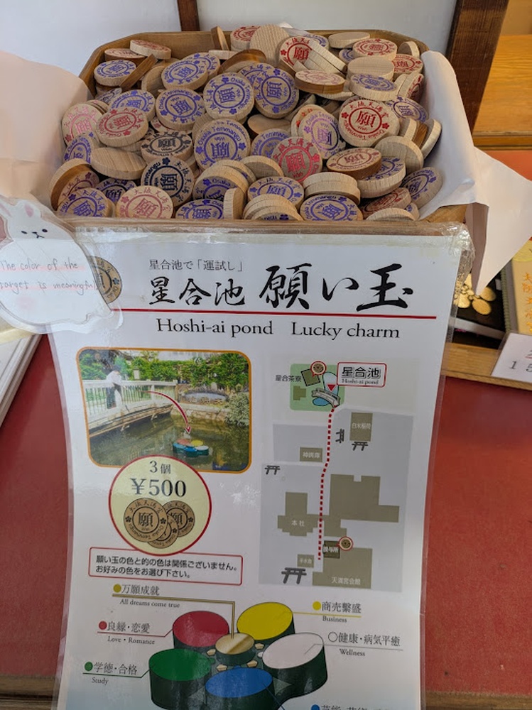 On Hoshiai Pond, there is a target shaped like a plum blossom floating on the surface of the water. The petals are colored red (good match in love), yellow (business prosperity), white (health), blue (performing arts and martial arts), green (success in exams), and gold (all wishes fulfilled). You throw the “wishing chips” at the petal color for the wish you want granted, and if a chip lands and stays on it, that means your wish will come true. Greedy as I am, I aimed for the gold petal for “all wishes fulfilled” only for the chip to miss completely and plop into the pond. The second one didn’t go well either, but the last chip landed right in the middle of all the petals. I decided to conveniently interpret that as meaning “all my wishes will come true”…