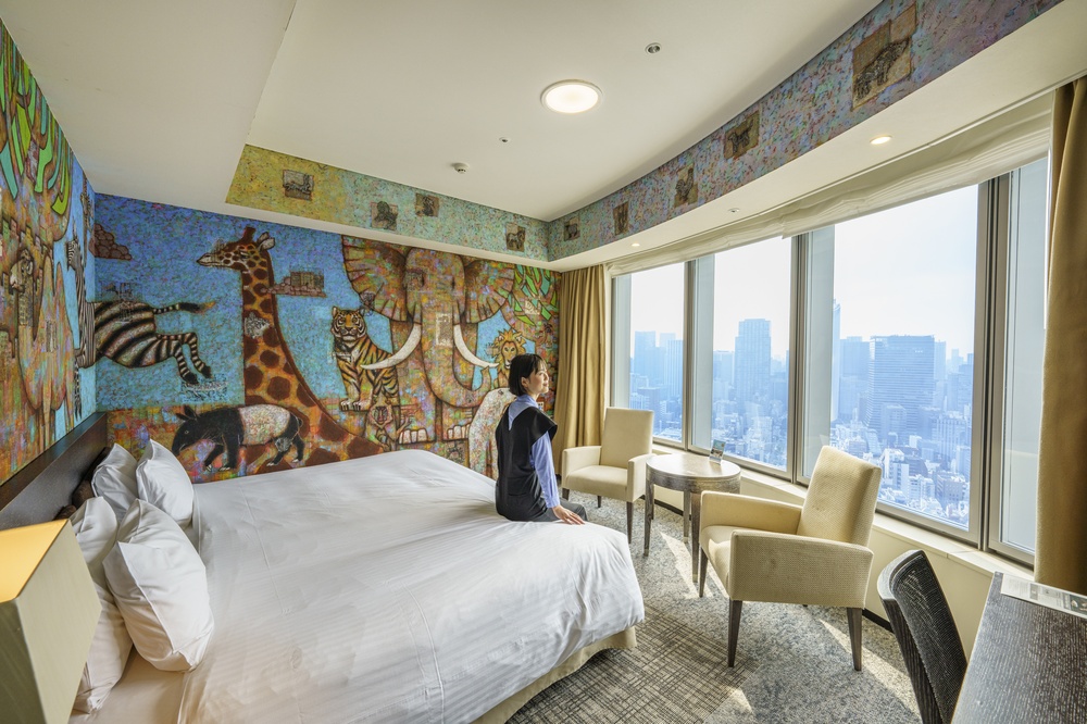 A special experience unique to the Park Hotel Tokyo is staying in an Artist Room. These distinctive rooms were born from a project in which artists create their works while staying at the hotel, and since 2012, 49 rooms have been opened. According to hotel staff, the project began with the desire to “have guests enjoy art in the guest rooms where they spend the most time in the hotel” and to “provide guests with a special art experience.”