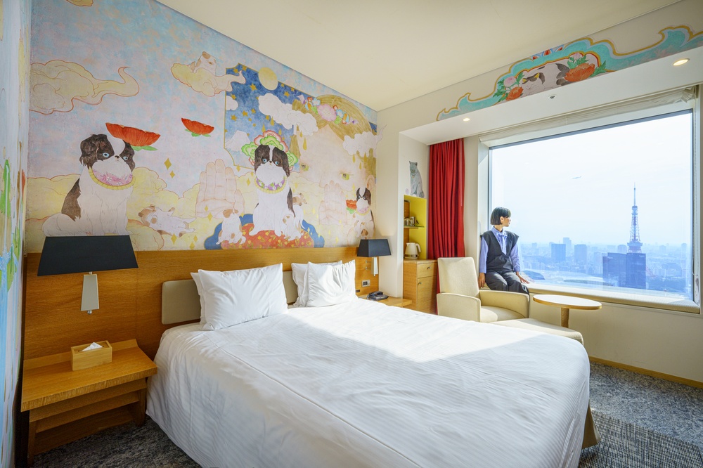 I visited several Artist Rooms right away. Room 3404, created by Yumi Hosaka and titled “Kawaii,” has an immersive quality that makes you feel as though you’ve stepped into the world of ukiyo-e or Japanese Nihonga painting, yet there’s also a wonderful sense that you could somehow relax here… The backstory is that the room was created with Japanese aesthetic sensibilities in mind, while also envisioning how guests would spend their time. The best part is the cute cats, dogs, and deer—their faces full of personality. It’s a room that makes you want to stay in this space forever.